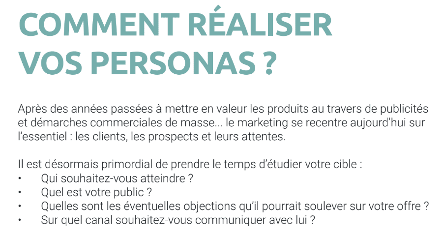 La définition de vos personas (prospects et clients) est l’étape cruciale pour déterminer le profil de votre audience, et en quoi votre produit ou service répond à ses attentes : que recherchent-ils ? Que veulent-il ? Comment pouvons-nous les aider ?