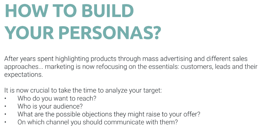 The definition of your personas (prospects and customers) is the crucial step to determine the profile of your audience and how your product or service meets their expectations: what are they looking for? What do they want? How can we help them?